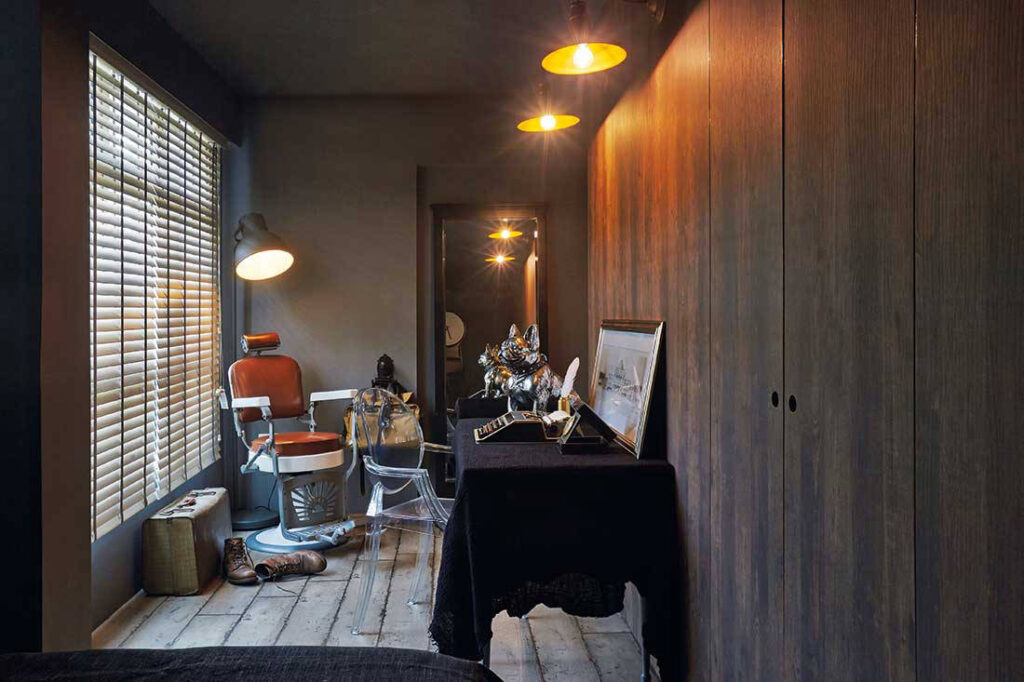 Two rooms have been combined to create this spacious bedroom that accommodates a large wardrobe, and a quaint dressing and sitting area complete with a repurposed barber’s chair. With an enlarged floor space, the original entrance has been closed up, affording the room with a high degree of privacy. To enter this room, you walk through the passageway and turn left to enter the main area.