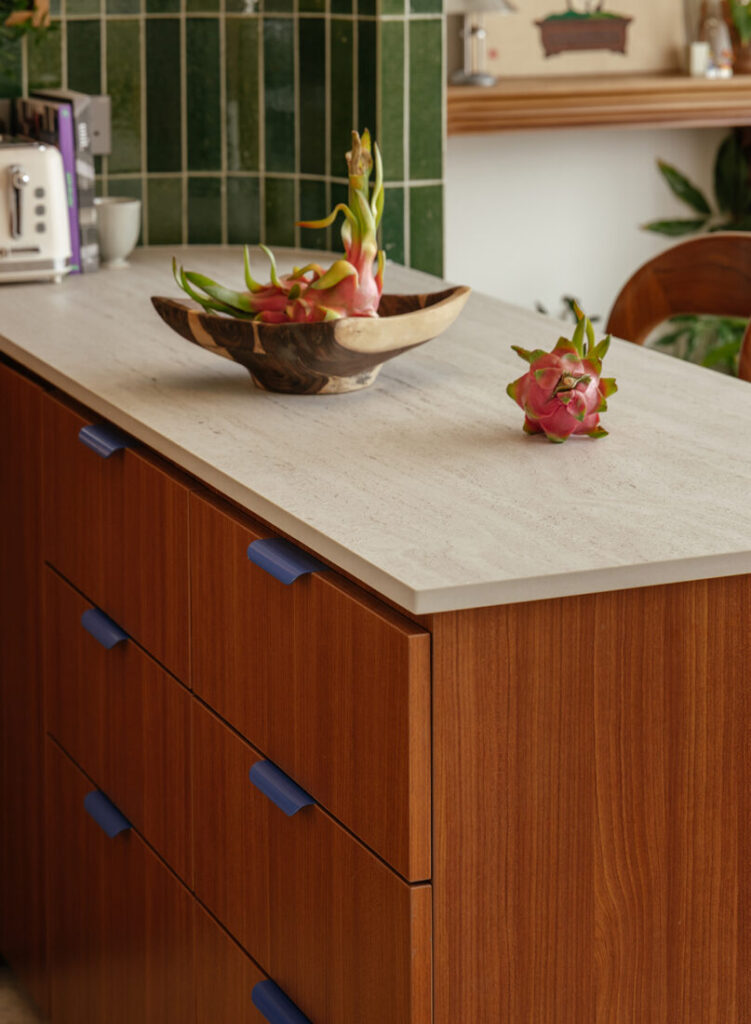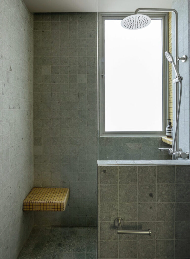 Throughout the apartment, colour and texture are applied with a confident, expert hand. The living and dining area features a long, tile-cladded bay window reimagined as built-in seating, display ledge and indoor plant corner. In the master bedroom, a custom bedhead integrates cantilevered red drawers and functional ledges, paired with half-moon wardrobe handles that add a note of play without disrupting cohesion. The bathrooms are similarly considered: the master bath offers a calm, tactile experience through Sukabumi stone, while the common bathroom embraces cheerful mosaics and small, expressive details.