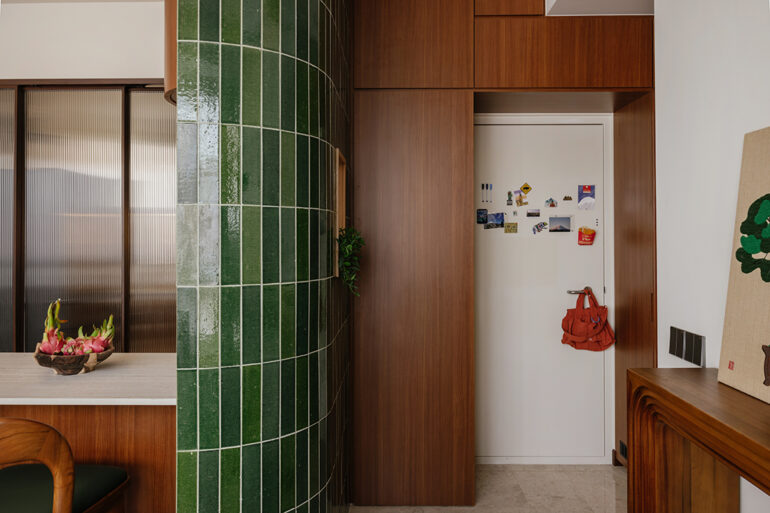 Before the renovation, a direct line of sight from the entrance corridor led straight into the bedrooms — an arrangement that felt abrupt spatially and less than ideal from a feng shui perspective. This became the key point of intervention where the designers introduced a curved feature wall clad in non-rectified emerald green tiles, positioned just beyond the entry. Acting as both spatial filter and visual anchor, it softens the arrival sequence while introducing privacy. A small opening carved into the curve maintains a degree of visual connection across the home, creating a layered sense of depth rather than full exposure.