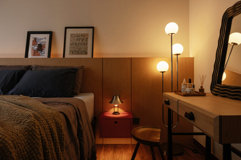 Importantly, not everything was replaced. Much of the existing marble flooring in the living area and parquet flooring in the bedrooms was retained. “We believe in working with existing quality materials where the conditions permit,” the designers note — a principle that also informed the repurposing of salvaged marble tiles to form a custom threshold at the relocated entrance to a common bedroom, ensuring continuity along the corridor.