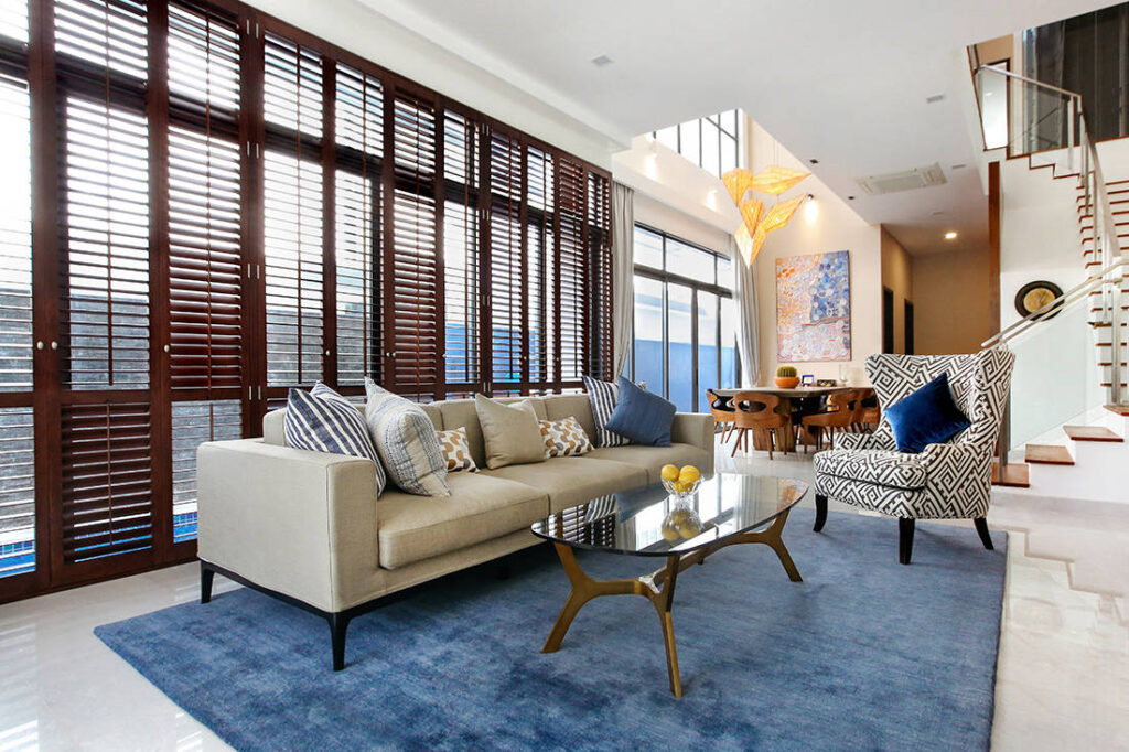 This is best exemplified in the living room, which enjoys a deluge of natural light streaming in through the tall windows and sliding doors. Here, Third Avenue Studio installed shutters on the glass doors. Its inclusion isn’t just based on the aesthetics, as the specially ordered window shutters have a more practical function. “The glass doors lead out into the lap pool, and we wanted some sort of safety barrier for the young children,” they explain.