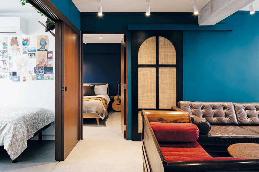 A glimpse into the son’s bedroom from the living room reveals a continuation of dark colours from one space to another. Since each family member favoured a different style, the design team came up with an eclectic yet somehow cohesive design language that balances the use of dark and bold colours – black, teal, red and navy blue – and modern materials with vintage elements like rattan and gold sanitary ware.