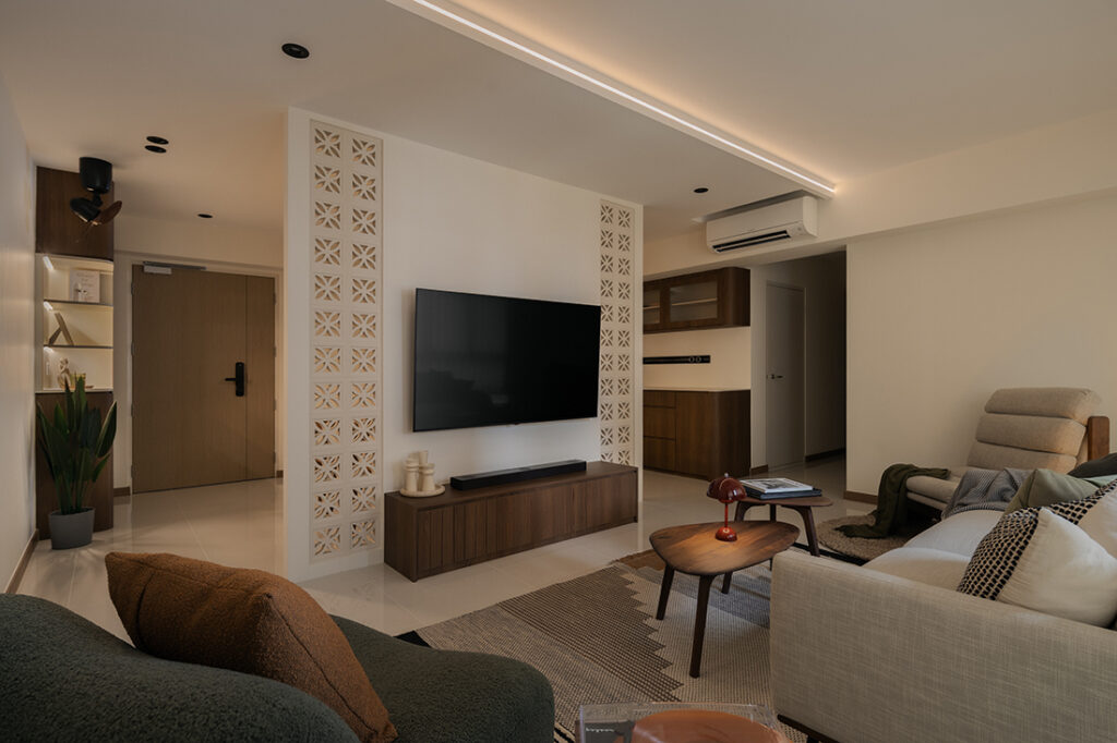 “As the unit is by the corridor, the homeowners wanted a divider at the entrance to provide privacy while keeping the house ventilated,” explains Daniel. Given the living room’s squarish layout, a solid wall would have made it feel smaller and less airy, so Daniel and his team used breeze blocks instead, which also double as the TV wall. To maintain visual continuity, the TV console was customised in a walnut finish to match the dining area, while light-toned walls quietly highlight the richness of the darker furniture pieces.”