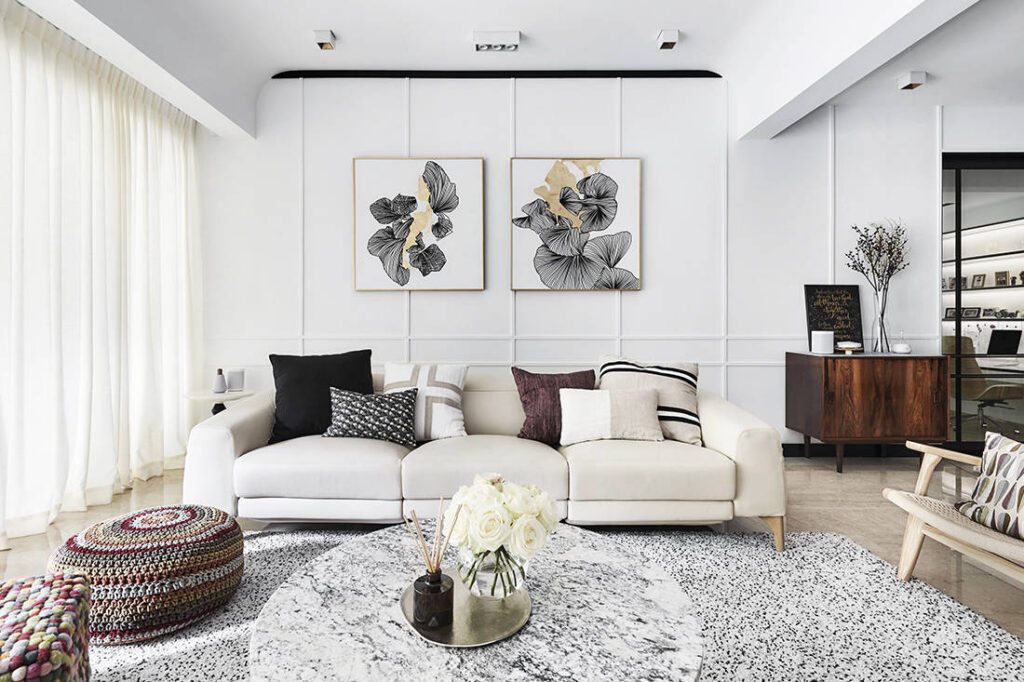 With the beams in this apartment exposed, the designers took a more refined art deco style approach by curving the edge of the beams off. They even added a faux curved beam in the living room, creating a C-shaped cocoon that defines the space beautifully. In addition, linear mouldings on the wall create a panelled look that’s typical of classical design, which the owners adore.