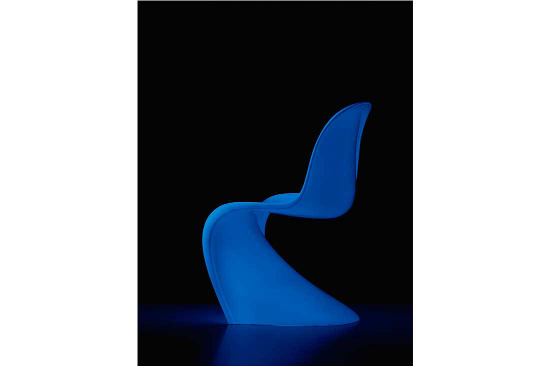 The Danish designer was also deeply interested in innovative technologies, techniques and materials. He worked with lighting, colour and luminous elements in many of his futuristic interiors. For his 1970 installation ‘Visiona 2’, in particular, he developed walls and ceilings that appeared to glow from within as a result of their layout and colour scheme, giving the room a psychedelic look. With this in mind, Vitra has developed the new Panton Glow. In an elaborate process, five layers of varnish containing phosphorescent pigments are applied by hand to the raw polyester resin shell of the Panton Classic and sealed with a high-gloss protective coating. The luminous pigments absorb daylight and emit a blue glow in the dark.