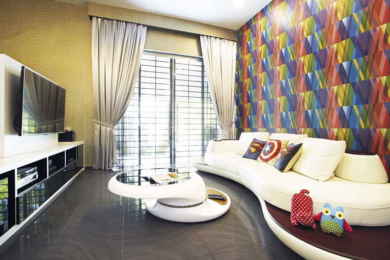 Patterns_D5-Studio-Image Want a quick update to brighten up your living room? All you need is brand new wallcovering. The rainbow-coloured wallpaper here is a strong, mood-lifting backdrop to the subdued colours in the rest of the home. Design by D5 Studio Image.