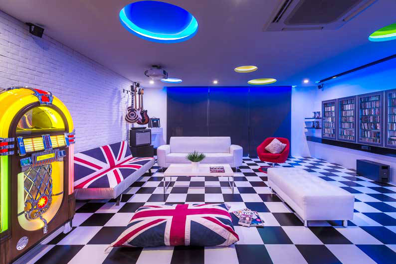Patterns_ID-Emboss Patterns are excellent for creating a themed home. In this home, the chequered floor tiles and Union Jack motifs encourage the Mod design that recalls the free-spirited fun of Britain in the 60s. This home also shows that lighting plays an equally important role in creating the right look. Design by ID Emboss.