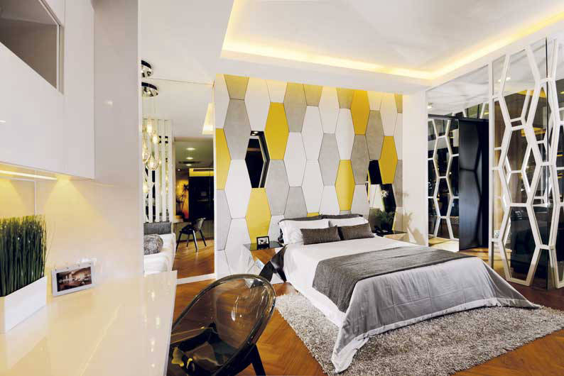 Patterns_The-Orange-Cube The abstract honeycomb-inspired pattern, the yellow, grey and white colour combo and the innovative ways the pattern is used throughout the room make this home a clear winner. There are countless ways to incorporate patterns into your home, and here, the interior designers create a customised wall behind the bed, and replicated the design on the partition that leads into the walk-in wardrobe. Design by The Orange Cube.