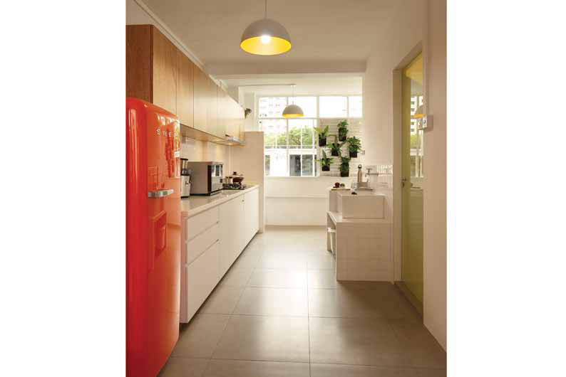 When dealing with a small kitchen (like those of 3-room HDB flats), designing an integrated kitchen-cum-dining table is a great way to maximise space. Contrary to popular belief, moving your preparation area away from the walls can create a sense of space with the extra room for circulation.