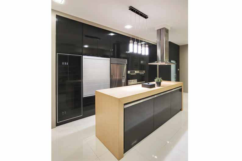 For a more polished look, go with cabinet surfaces like acrylic panels or glossy laminates. Your colour of choice for such glossy cabinets will also affect the feel of the space. Deep black cabinets lend a sophisticated urban vibe to the cooking space while muted neutral tones bring a softer, more elegant feel.
