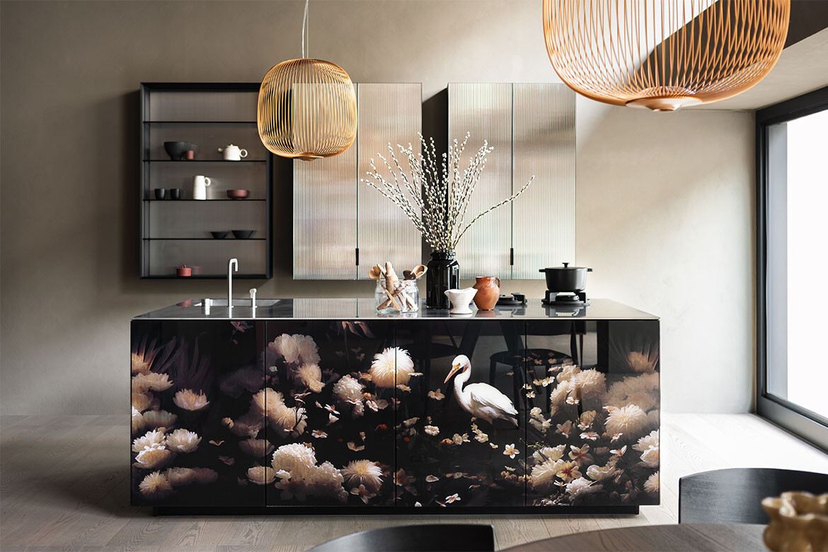 Wonder Landscape portrays a dreamlike landscape printed on the N_Elle kitchen island doors as seen at Milan Design Week this year using MVi Inalco (Minerals, Vitrified, innovation). The revolutionary production process involves the high-temperature fusion of the purest mineral powders to the glass surface via a digitally controlled process, ensuring long-lasting permanence. This system allows for projects with rich chromatic depth, offering a recyclable surface of high value with textures that enhance depth and naturalness, visually and tactilely.