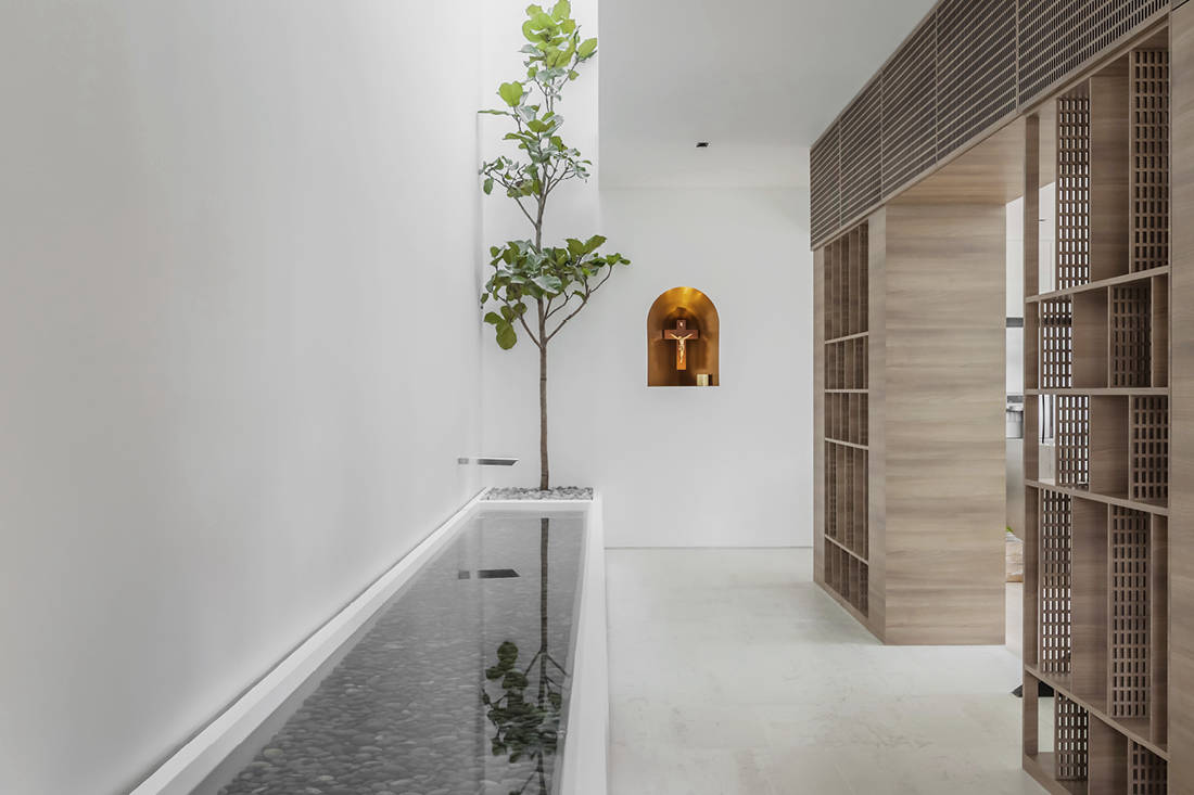 About the project: This house features a prayer space, designed as a sanctuary punctured only by daylight. An eight-metre long cabinet here incorporates bookshelves and storage space, while screening this space from the rest of the house. As for the rest of the house, colours and textures are also kept to a minimum to create stillness and visually bring in exterior’s surrounding greenery.