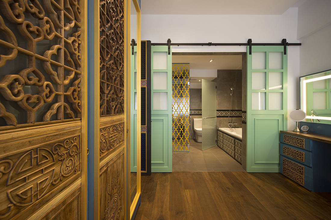 About the project: The homeowners wanted a relaxing feel in their home, and for it to have a touch of Peranakan style. The use of old Peranakan tiles, wooden elements and colour gives the apartment its unique character.