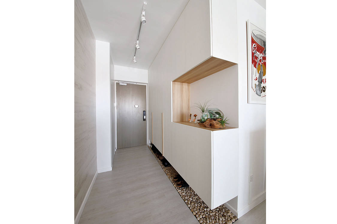 This entrance foyer of a 790sqft DBSS apartment designed by Free Space Intent cleverly addresses the issues of styling and storage. Slim tall cabinets line the full stretch of the wall, but one end of the cabinet wall features a “cut out” niche that provides the opportunity for displaying decor objects and curios. Meanwhile, the tall cabinets are finished in predominantly white laminate, which helps it blend into the wall.