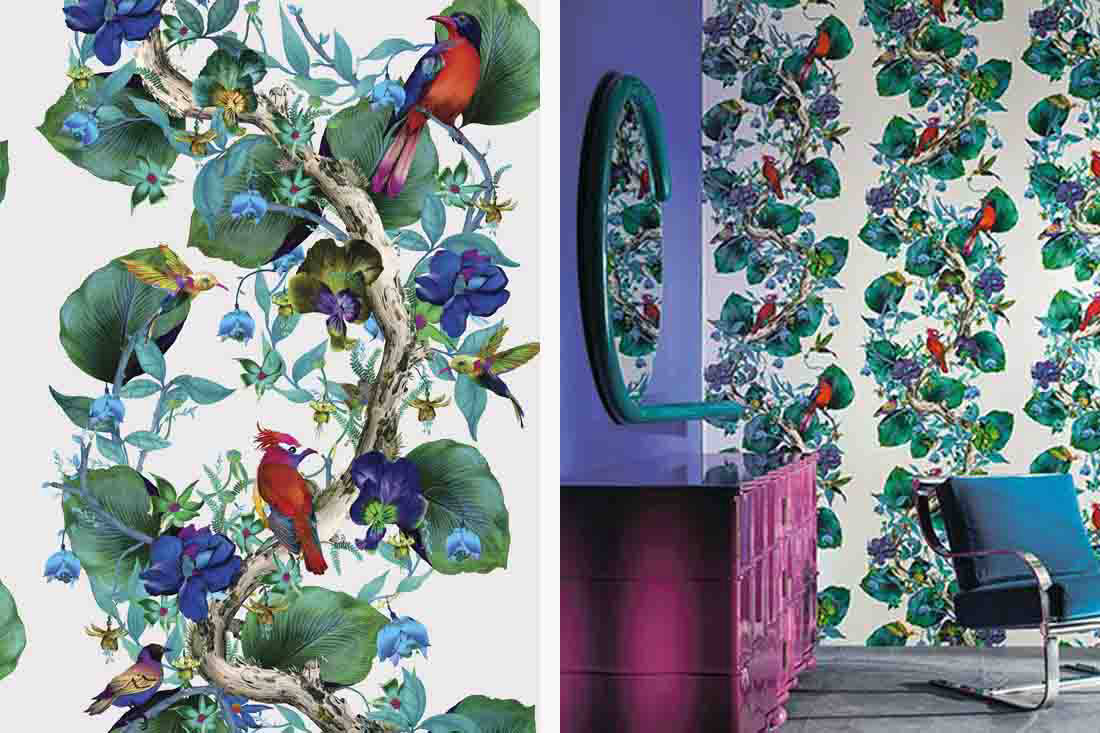 #6 The Osborne & Little Enchanted Gardens Rain Forest wallpaper has a repeated vertical print, with bold and bright leaves, flowers and birds. Available at Danovel.