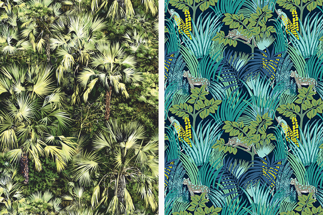 #2 The Pierre Frey Vue d’en Haut (left) and Kipling wallpapers have modern, tone-on-tone designs with tropical prints. Available at Romanez.
