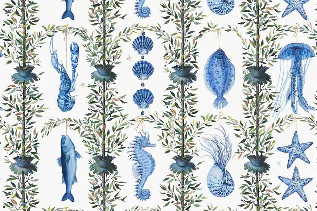 #8 The Pierre Frey Bonne Peche wallpaper with ultramarine blue and moss green colours is inspired by seafood market stalls, for a whimsical look. Available at Romanez.