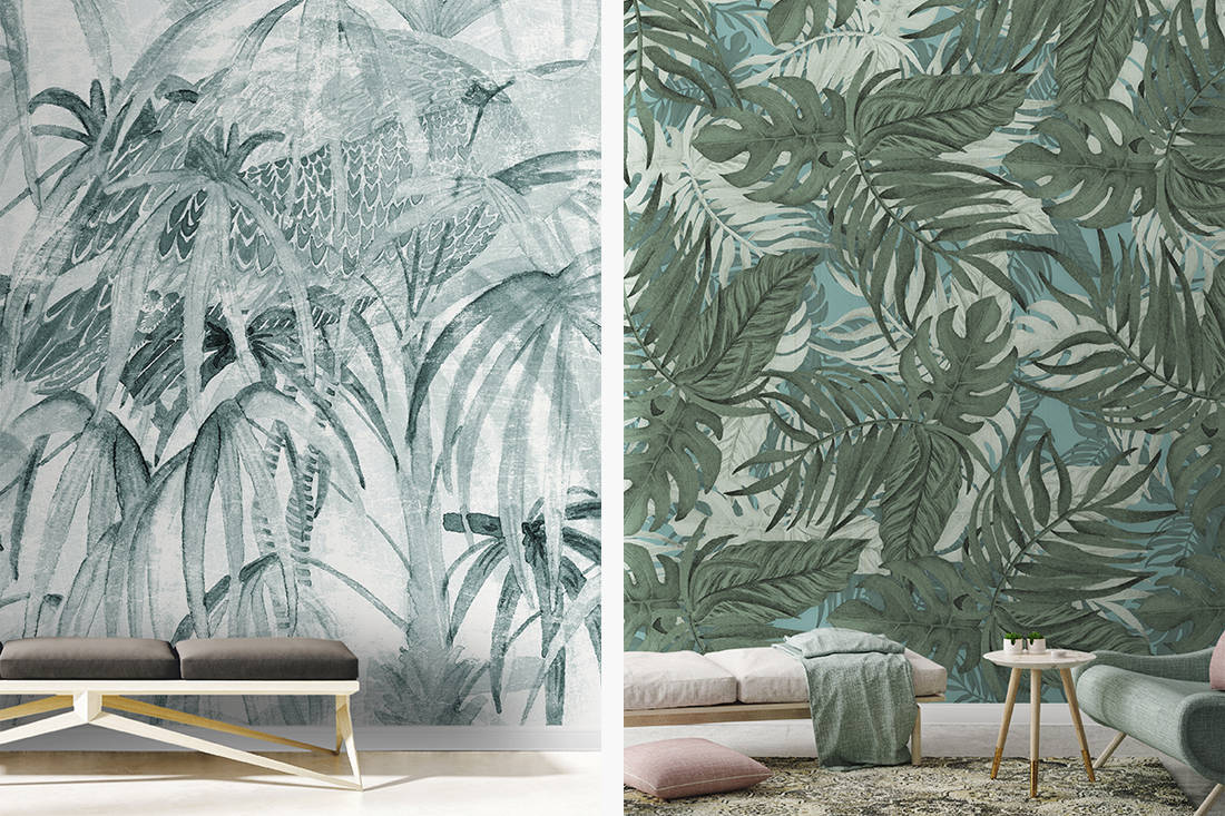 #7 The Tropikos collection, including Chineleaves (left) and Palmania, features scenes of tropical nature that appear to be painted and drawn. From Wallpepper.