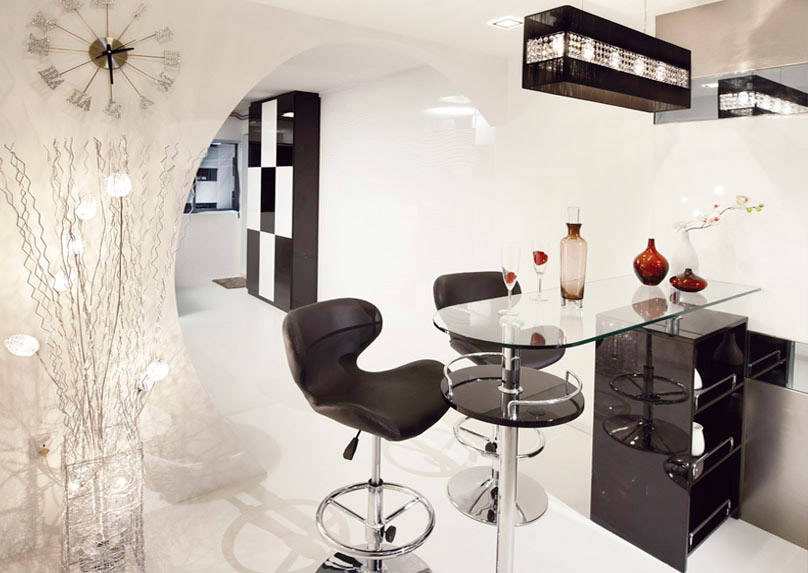 Overlooking MacRitchie Reservoir Park, this ultra spacious condo apartment at Sky@Eleven captures the essence of upscale living. Adopting a predominantly black-and-white palette, Unimax Creative gave the house a chic yet edgy aesthetic. The living room was furnished with a curved leather sofa, while the bar is equipped with a stylish glass table top and fancy swivel stools for intimate conversations over fine wine. See the rest of the home here.