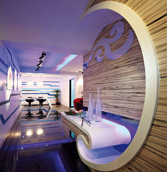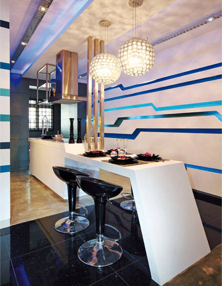 Thanks to the creative efforts of Chew Interior Design, the interior of this four-room HDB flat in Serangoon North is as whimsical as one can get. Looking like a cross between a nightlife establishment and a scene from a Tim Burton film, the apartment is illuminated by LED lights that casts the living room and adjoining hallway in a gentle violet glow. A red round sofa takes centre stage in the entertainment area, while the walls vary from wooden panels to white stone canvases bearing linear blue motifs. See the rest of the room here.
