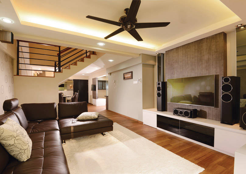 Achieving the perfect balance between homely comforts and club-esque luxe is this executive maisonette in Bedok Reservoir. Designed by Urban Habitat, the living room is perfect for entertaining guests with its flat screen TV and state-of-the-art stereo system, although the wooden flooring and brown leather sofa helps create a restful ambience. The stunning bar that adjoins the kitchen is partitioned by a wooden panel that offers the party host and guests some level of privacy. See the rest of the home here.
