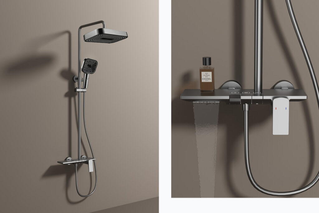 The square-profile rain shower and multi-spray hand shower offer flexibility for different routines, while the integrated mixer shelf keeps essentials within easy reach without disrupting the clean overall look. Available in Chrome, Gun Metal, and Brushed Steel finishes, the series also makes it easier to match fittings across different bathroom settings.