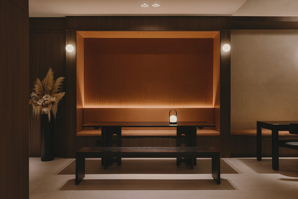 A more relaxed extension of the consultation area, the seating booths opposite include one with a recessed tiled wall backing, adding subtle texture. Padded in warm, earthy tones and softly illuminated, they offer a more informal setting for continuing discussions away from the main table.