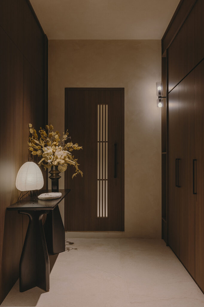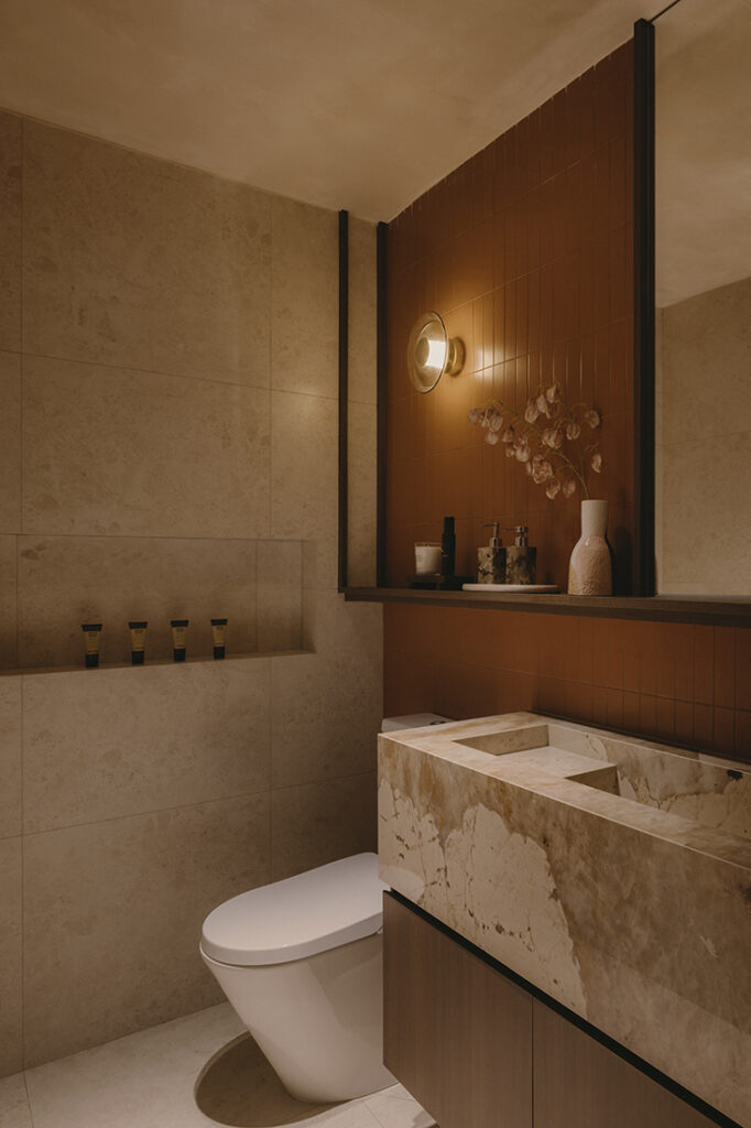 The washroom continues the design studio’s refined material palette with wall and floor tiles from Hafary. A custom, integrated sink cladded in Dekton is paired with streamlined cabinetry for a seamless look, while a sleek shelf keeps essentials neatly organised. Thoughtful lighting enhances the textures and creates a soft, welcoming glow — an approach homeowners can adopt to bring a touch of boutique-hotel elegance to their own bathrooms.