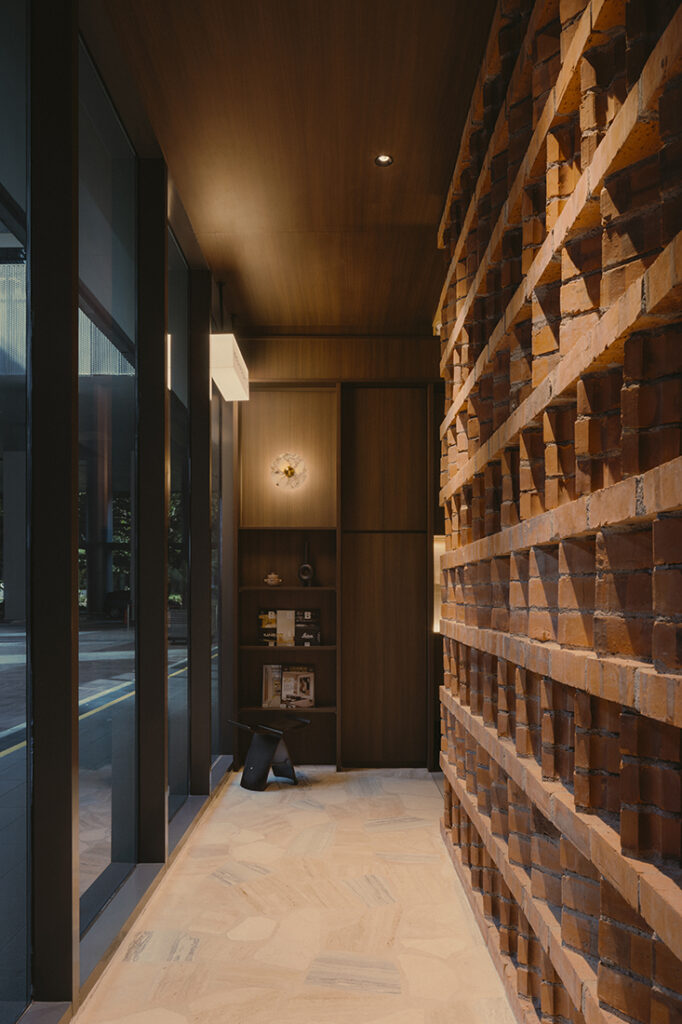 Visitors are first greeted by a dramatic entryway where broken marble, salvaged from trade waste bins, meets reclaimed brick. This pairing sets the tone for the studio’s commitment to sustainable design, turning discarded materials into striking features. “The brick wall creates anticipation, guiding clients inward, while broken marble flooring adds tactile and visual intrigue to the space,” says Ryan.