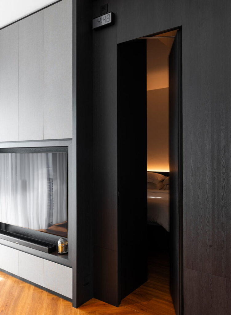 Designed by MYNMYN Studio for a couple who value quality over quantity, this compact home channels boutique-suite serenity through a restrained palette, a bold feature wall, and thoughtful detailing.