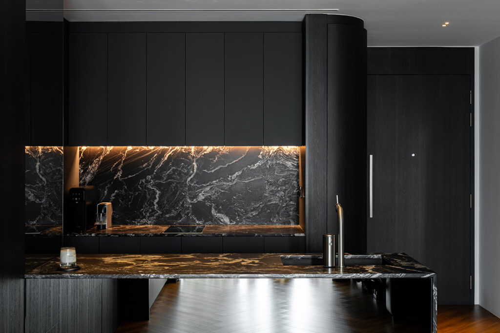 Moving into the kitchen, design precision is evident in the layering of finishes. The island’s granite countertop from Lian Hin adds a tactile, grounded quality, while anti-fingerprint laminates from Lamitak ensure durability and effortless maintenance. Despite the unit’s compact footprint, the kitchen reads as spacious due to its clean geometry and minimal junction lines.