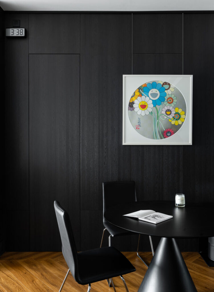 The defining gesture of the home lies in its full-height feature wall – a sleek, continuous element that stretches from the living area through to the kitchen. This single surface anchors the entire space, drawing the eye across the length of the apartment. Its dark, tactile finish creates contrast against the surrounding white walls, amplifying the sense of spaciousness and calm.