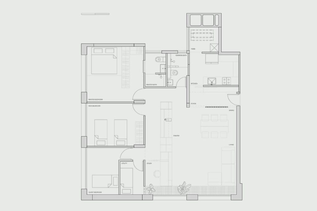 The design effort centred on reorganising these common areas to feel open yet controlled. A newly inserted concrete vent block screen establishes a foyer and a clear transition between the entrance, kitchen and living spaces, preventing the home from being immediately visible and creating a more measured sense of arrival.