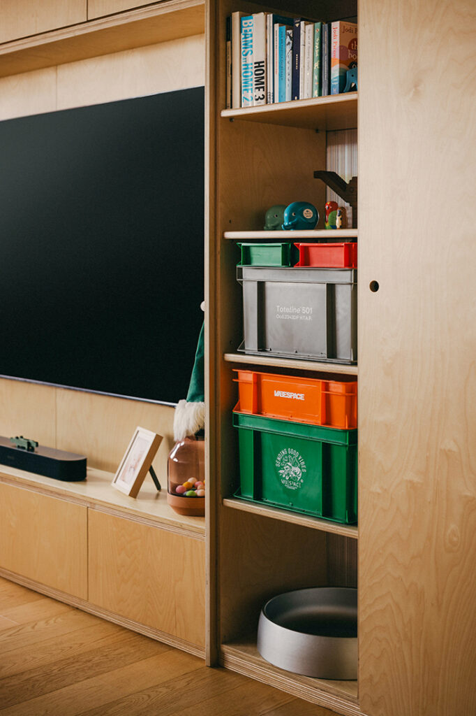 That change in material also plays a spatial role. “This deliberate move allows an offset of the “Wonder Wall” from the edge of the windows, creating a fun little area for the kids and the cats to run around,” says Clifford. What might otherwise have been leftover space becomes an informal loop for movement and play — a reminder that this is a home shaped by daily routines rather than display.