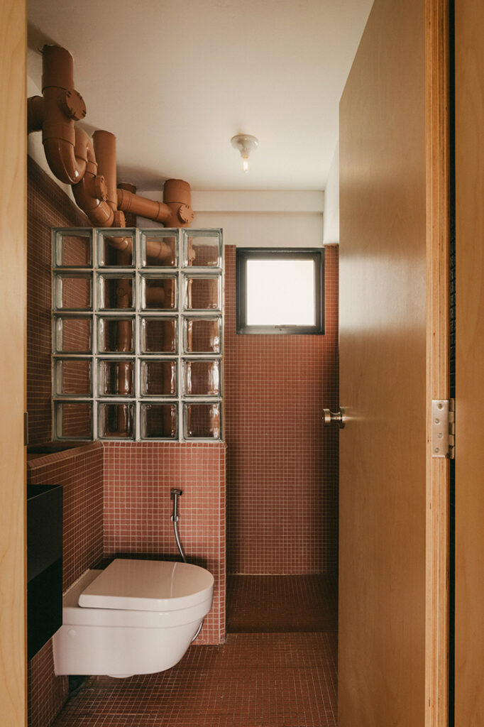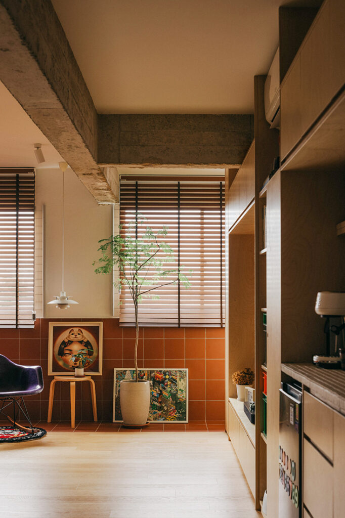 Material decisions further articulate these shifts in space and use. To regularise the living room into a more functional footprint, the original balcony was removed, but not erased entirely. “As an homage to the removed balcony, a small strip of terracotta tiles sits in its place, giving another layer of colour and texture that is reminiscent of an outdoor material, where plants were placed to take advantage of the natural daylight along the perimeter,” says Clifford. The gesture introduces warmth along the window edge while acknowledging what once existed.
