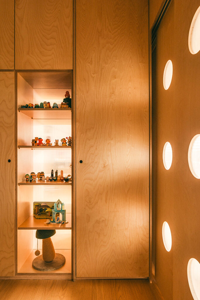 At the heart of the layout sits the project’s defining feature: the “Wonder Wall”. Conceived as a spatial device rather than a conventional partition, it anchors the plan while softly separating shared spaces from the home’s private zones. Beyond serving as a divider, it consolidates multiple functions — from storage and display to a dry pantry and study nook (in the bedroom facing side) — while allowing the existing bedroom layout to remain intact.