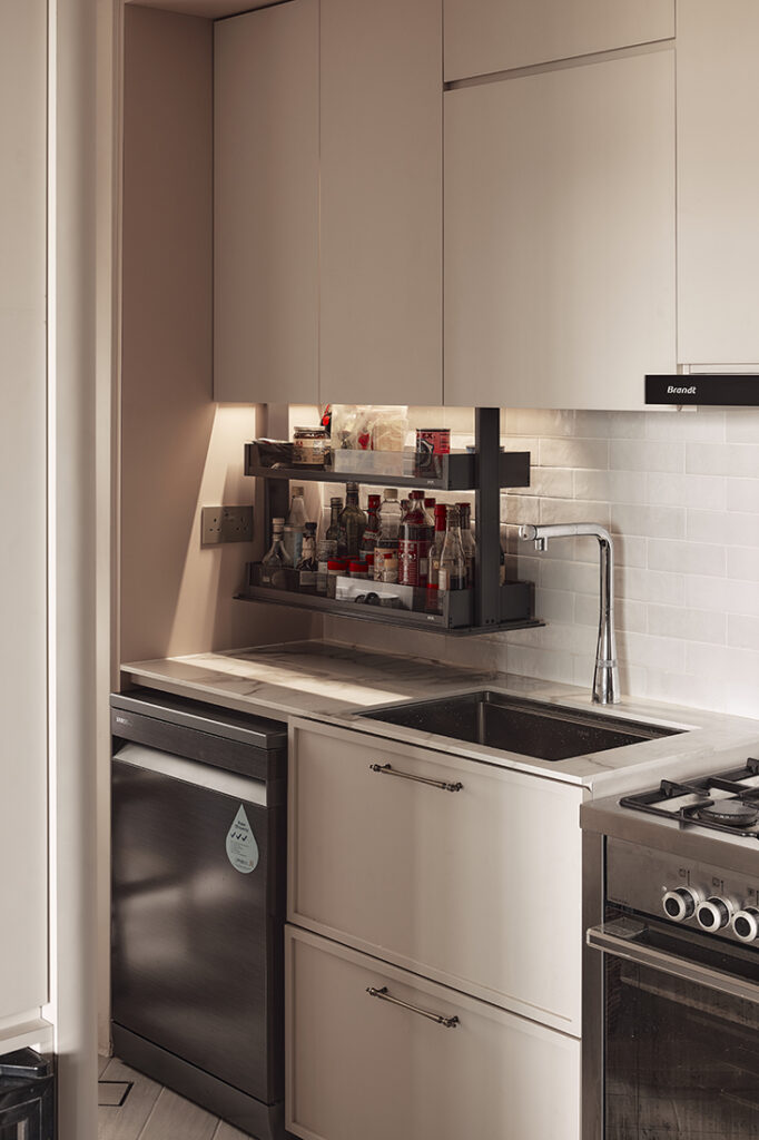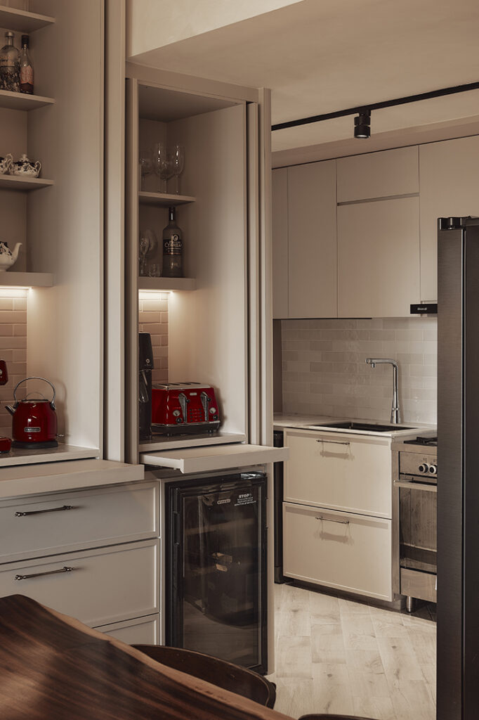 In the kitchen, practicality leads. With the original walls removed, the space now operates as an open extension of the living area while still accommodating serious daily cooking. A dry and wet pantry arrangement allows tasks to be separated when needed, and pocket doors can conceal the dry pantry during hosting. The refrigerator is positioned between the two zones for easy access, while an automated sauce rack system integrates neatly into the cooking area.