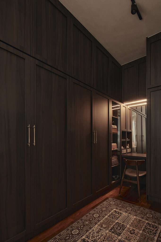At 1,342 square feet, this three-bedroom condominium has been reworked to reflect what its owners value most. Designed by Flora Ngoo of Ofthebox, the renovation replaces the expected television wall with something far more personal: a reading area set beside an indoor “balcony” created for plants, positioned deliberately at the centre of the home.