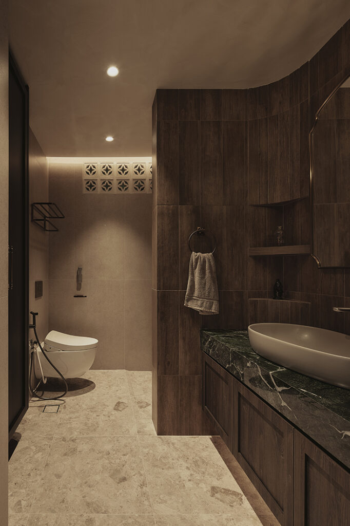 In the master bathroom, removing the original built-in bathtub made way for an expansive vanity clad in emerald stone. Ventilation blocks introduced above the shower resolve the absence of windows, bringing airflow and a subtle textural detail visible from the corridor.