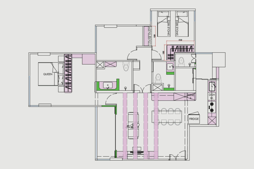 The master bedroom is organised around a single architectural move. A wardrobe block forms a walk-in dressing area on one side and becomes a featured bedhead for the existing bed frame on the other. This creates two distinct pockets within the room: a more private sleeping zone that can also accommodate an armchair for reading, and a separate dressing area that allows for different wake-up routines without disruption.