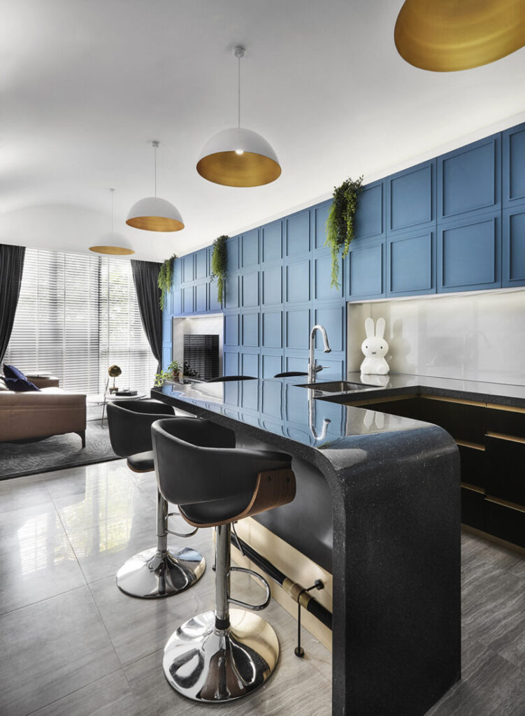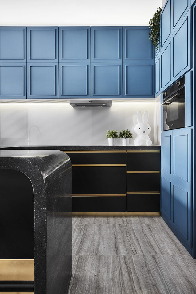 The panels’ linear mouldings reinterpret the classical panel with a fresh, modern twist. At the same time, a subtle concave false ceiling further refines the space, softening the boxy geometry and heightening the sense of openness. Gentle curves continue into the C-shaped kitchen peninsula, where a solid-surface countertop cascades elegantly into a waterfall edge. Bronze-finished inlays and smooth contours add tactile richness without excess, demonstrating a blend of restraint and precision.