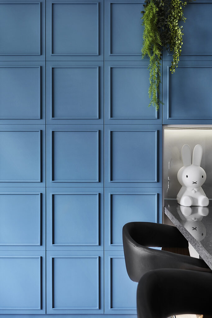 What began as a modest, storage-starved apartment has been reimagined with the confidence and polish of a Manhattan loft. Drawing from the city’s old-world glamour, Lawrence layered the home in rich materials, bold tones and sculptural geometry. The most striking visual statement is the series of aquamarine “chocolate bar” feature walls – a playful nickname for the moulded panels that stretch across the living and dining zones, concealing storage behind them.
