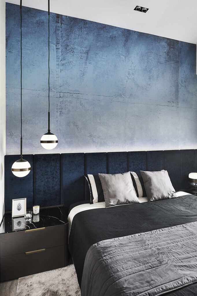 In the bedroom, Lawrence softened the mood with a suede-padded headboard set against a blue gradient wallpaper, flanked by marble-topped side tables. The design extends the home’s visual language of elegant lines, tactile layering, and tonal harmony, creating a sanctuary of calm.