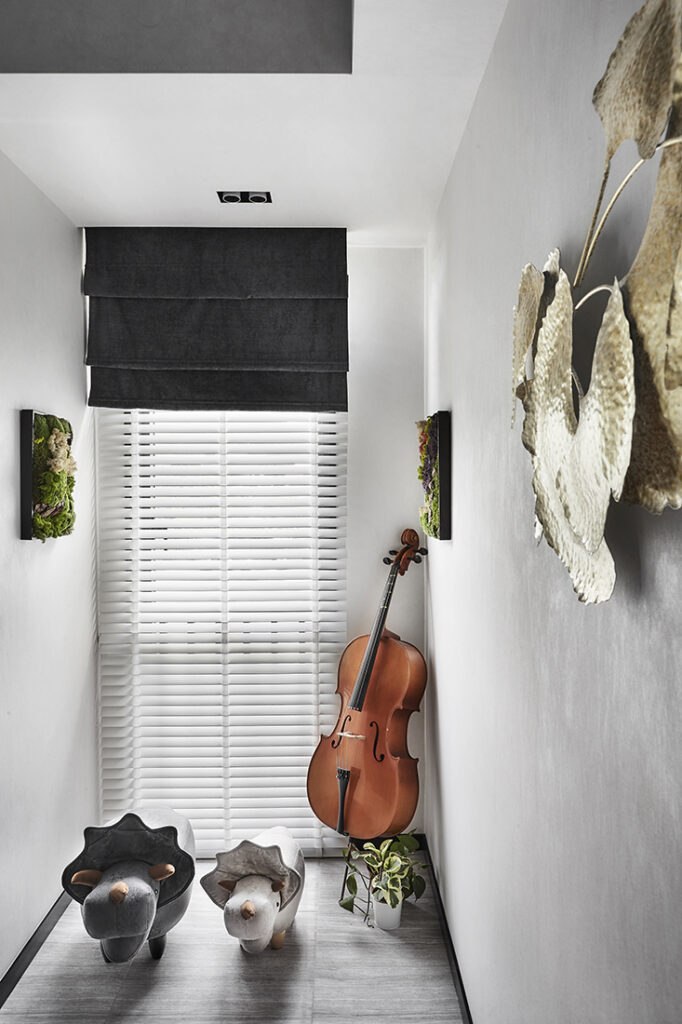 Subtle personal touches added depth to the loft-inspired aesthetic. The homeowners, both dental professionals, wanted the home to reflect their personality and memories of Manhattan. A custom wool rug maps the city’s iconic grid in abstract form, complete with a red highlight marking where they once lived. In another corner, a music nook showcases their cello and handmade moss artworks, turning a former wardrobe space into a tranquil escape.