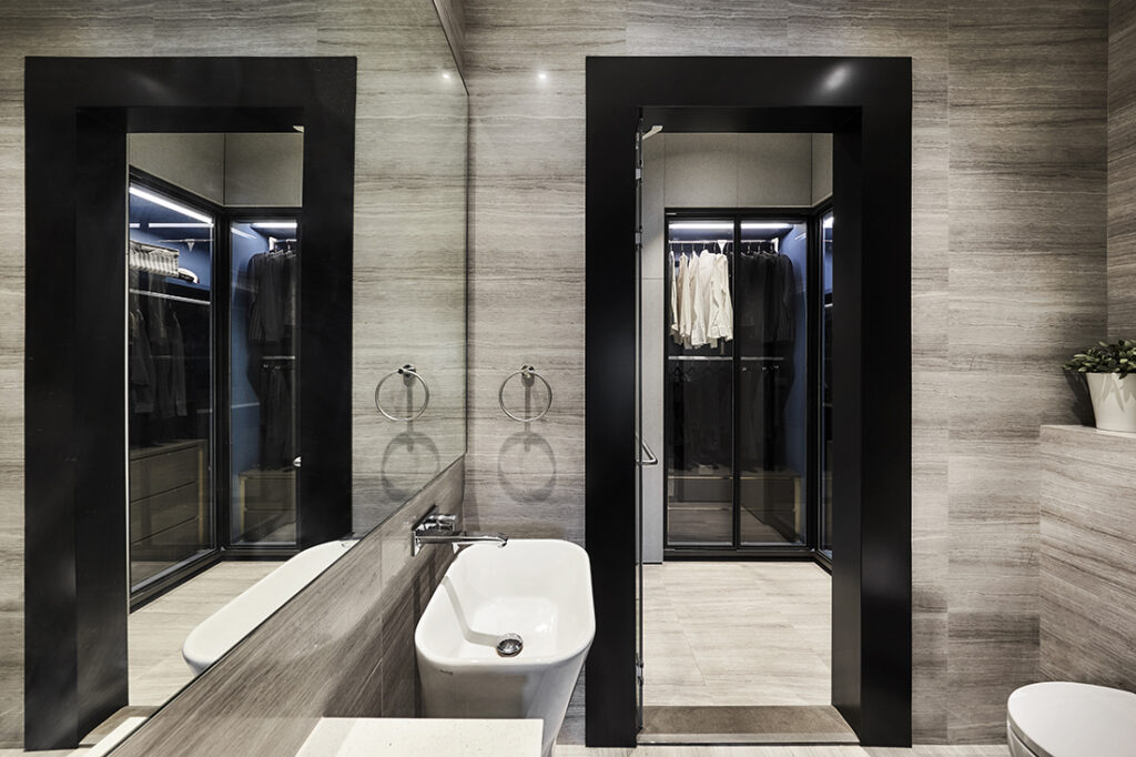 Lawrence’s attention to visual consistency extended across every aspect of the home. A previously plain front door, for example, was reworked internally with custom bronze inlays, subtly echoing the accents throughout the home. Each gesture ties back to the idea of design continuity – ensuring every element feels cohesive and intentional.