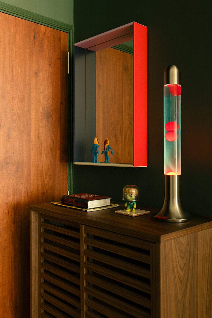 The living and dining area sits at the heart of the home, anchored by a solid wood dining table and a deep green sofa that invites long meals and unhurried evenings. The family’s personality comes through in the details — a Saint-Denis ’98 football poster, playful ceramics, and a mix of vintage and contemporary furniture. “We intentionally minimised built-ins… and instead created open surfaces and display zones so their art, plants, collectibles and found objects could be celebrated as part of the home’s personality,” the designers note.