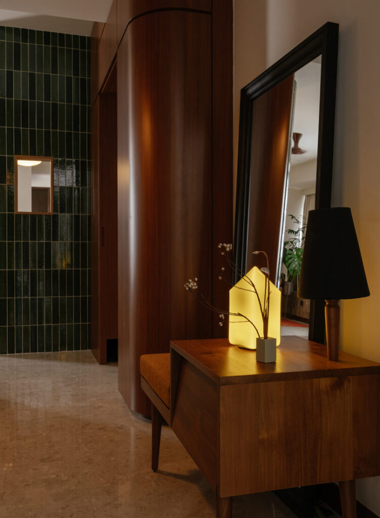 Before the renovation, a direct line of sight from the entrance corridor led straight into the bedrooms — an arrangement that felt abrupt spatially and less than ideal from a feng shui perspective. This became the key point of intervention where the designers introduced a curved feature wall clad in non-rectified emerald green tiles, positioned just beyond the entry. Acting as both spatial filter and visual anchor, it softens the arrival sequence while introducing privacy. A small opening carved into the curve maintains a degree of visual connection across the home, creating a layered sense of depth rather than full exposure.