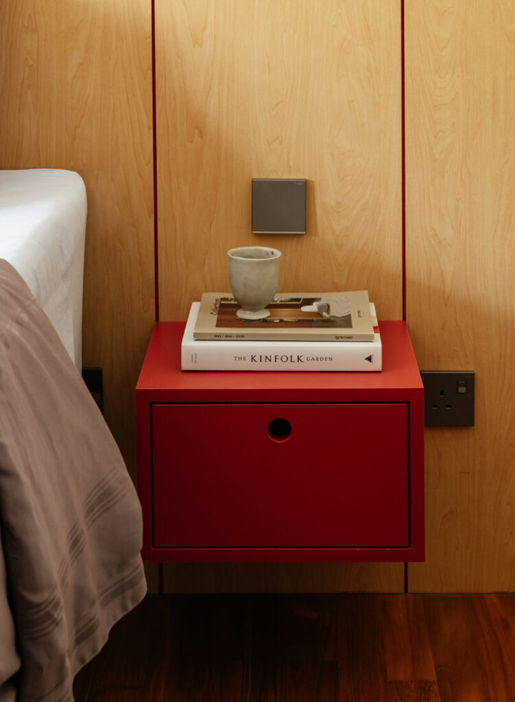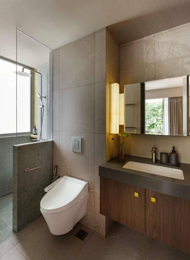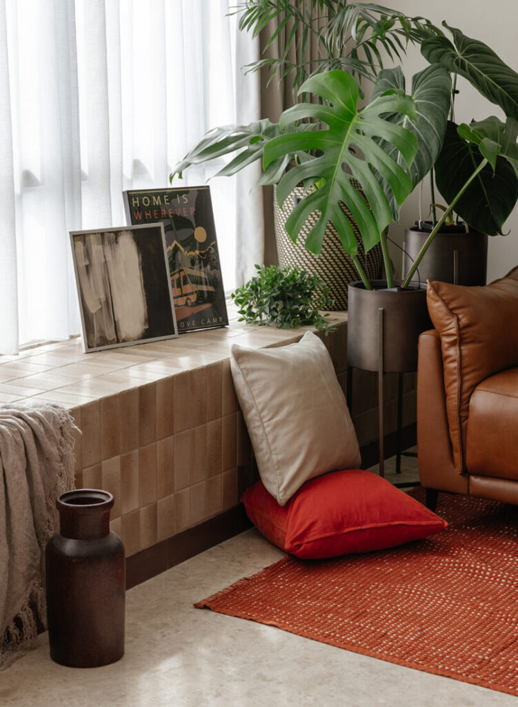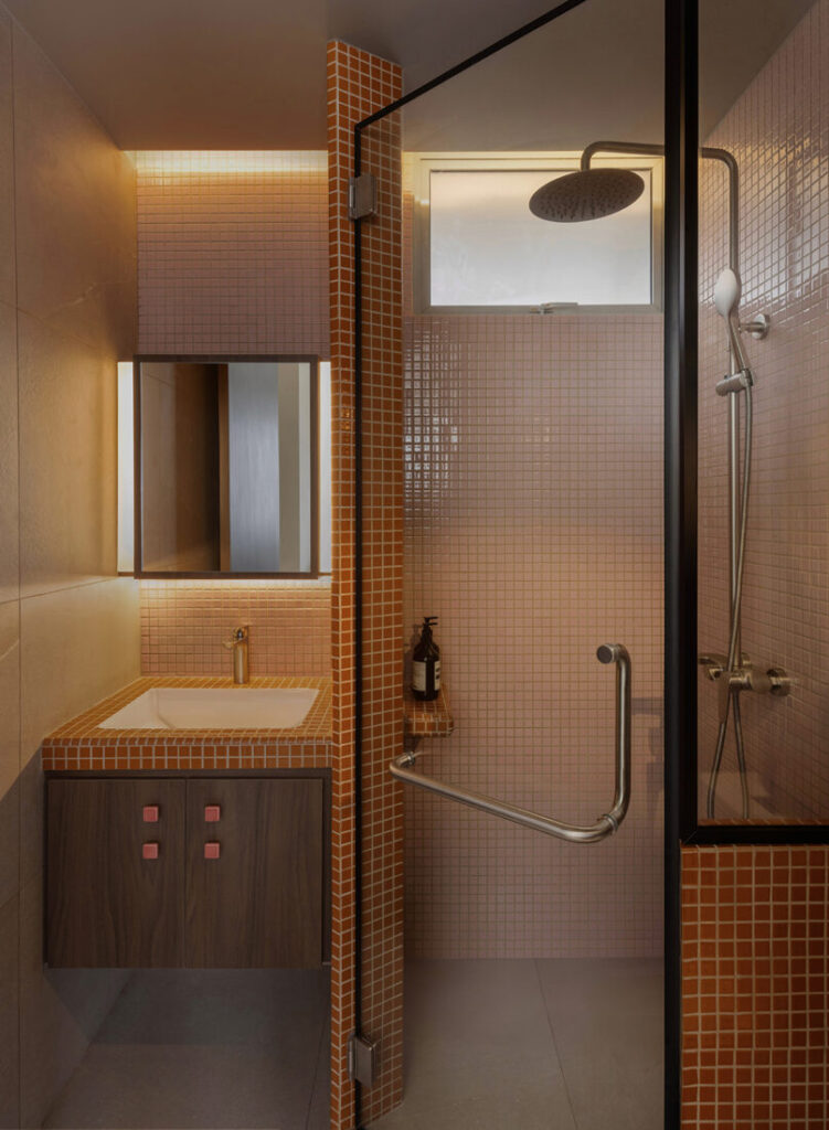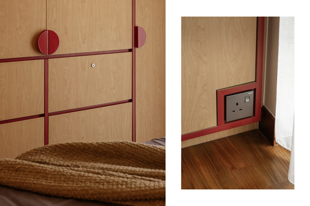Throughout the apartment, colour and texture are applied with a confident, expert hand. The living and dining area features a long, tile-cladded bay window reimagined as built-in seating, display ledge and indoor plant corner. In the master bedroom, a custom bedhead integrates cantilevered red drawers and functional ledges, paired with half-moon wardrobe handles that add a note of play without disrupting cohesion. The bathrooms are similarly considered: the master bath offers a calm, tactile experience through Sukabumi stone, while the common bathroom embraces cheerful mosaics and small, expressive details.