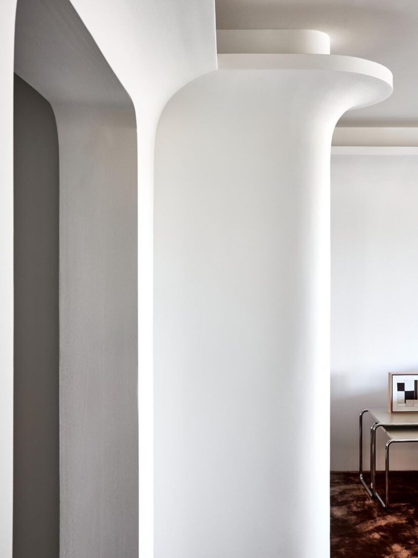 Originally furnished as the developer’s showcase suite, the apartment retains certain pieces such as the marble dining table. Inspired by the original arched doorways, the pelmet lighting encircles the living room, complemented by subtle curved plaster accents, enhancing the space with an air of elegance. Developed in collaboration with the clients, the curved pelmet light detail was designed to provide a soft, diffused illumination, eliminating any harsh, direct artificial lighting in the area, as per their preferences.