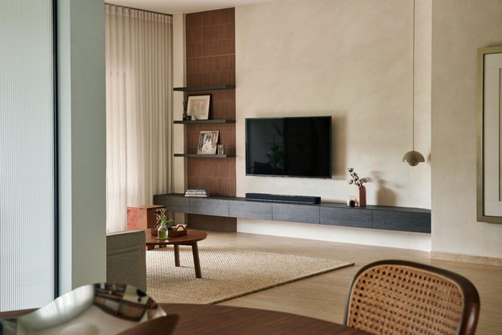 “We were mindful when developing the design to keep the material palette restrained,” explains Kelvin of his approach to evoke a sense of tranquillity and sophistication throughout the apartment. “Neutral, earthy tones helped set the stage for that, allowing vernacular elements to shine.”